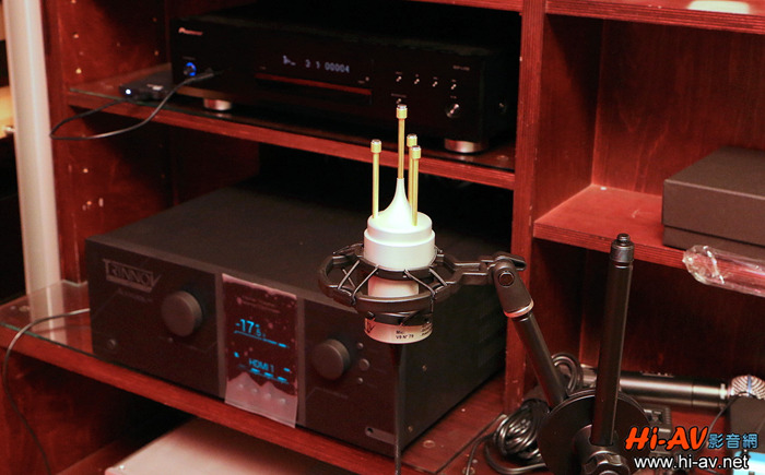 這是Trinnov Audio Altitude32所附的獨家專利金字塔形量測設定麥克風,通過較高的一支與下方的三支麥克風同時作用,可精確測定所有音箱的距離、高度與方位角,讓 Altitude 32“看見”視聽室內所有音箱的相對位置,這是一般環繞放大器“單點麥克風”所辦不到的(即使某些品牌利用三個位置來量測,也只能得到水平角度與距離,無法有高度資訊來建立3D相關位置)。